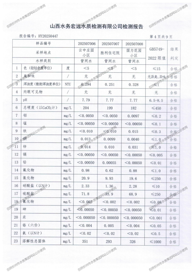 忻州城區(qū)公共供水水源水、出廠水、管網(wǎng)水、管網(wǎng)末梢水2025年7月份水質(zhì)信息公示