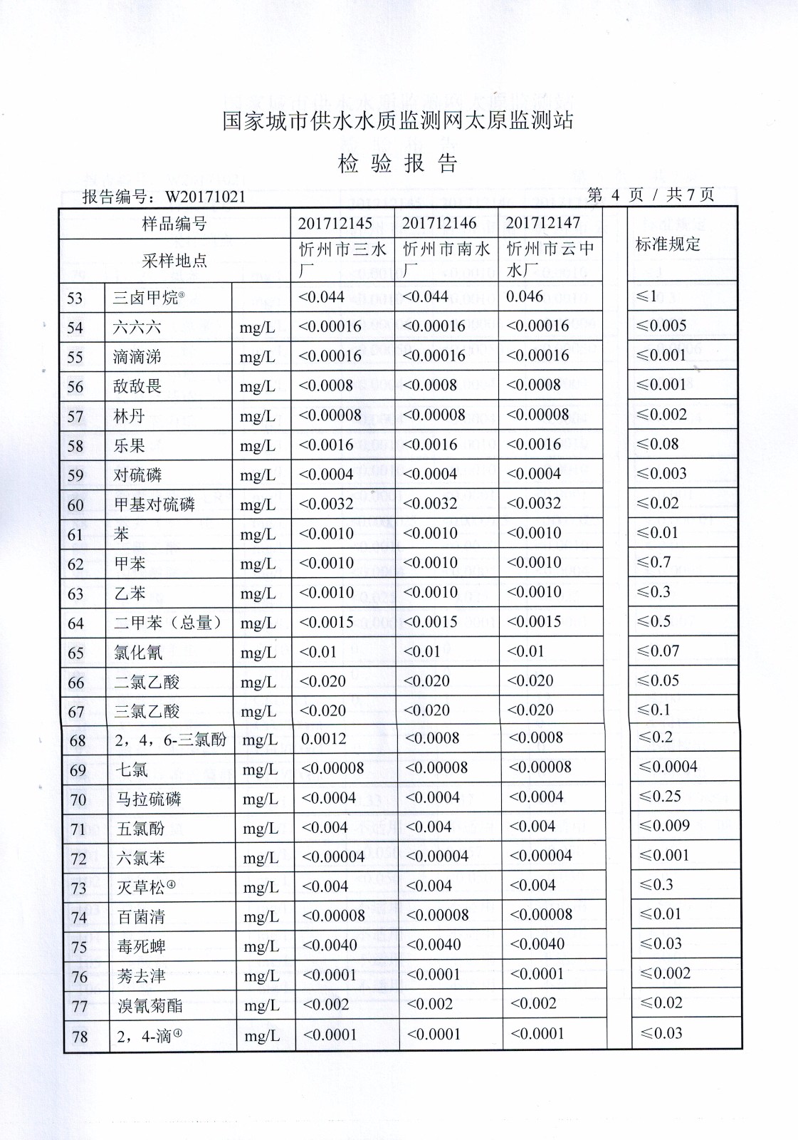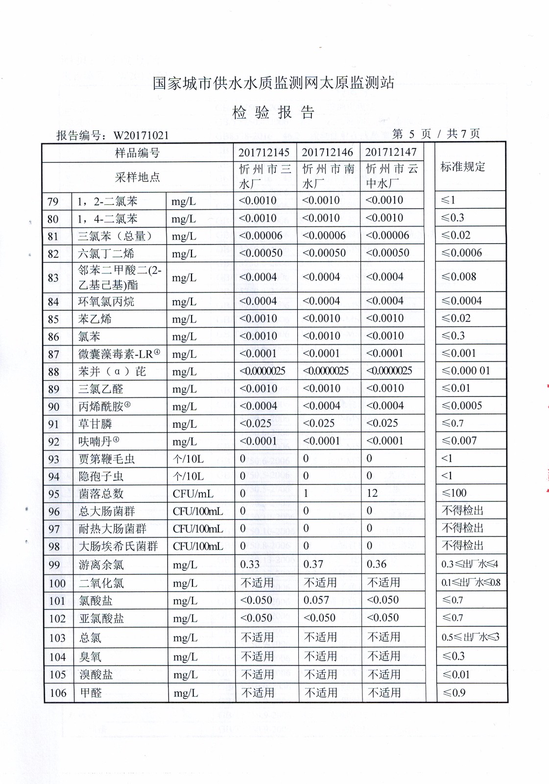 2017年忻州城區(qū)公共供水南水廠、三水廠、云中水廠出廠水106項水質(zhì)全分析