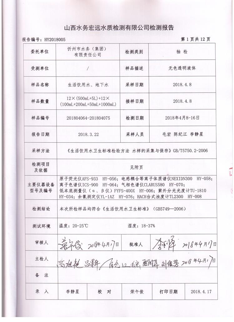 忻州城區(qū)公共供水水源水、出廠水、管網(wǎng)水、管網(wǎng)末梢水2018年4月份水質(zhì)信息公示